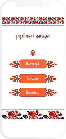 Set of more than 1000 Ukrainian riddles with answers, grouped into 10 categories: food, human, everyday life, work, nature, misc, free time, sport, transport and school.