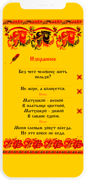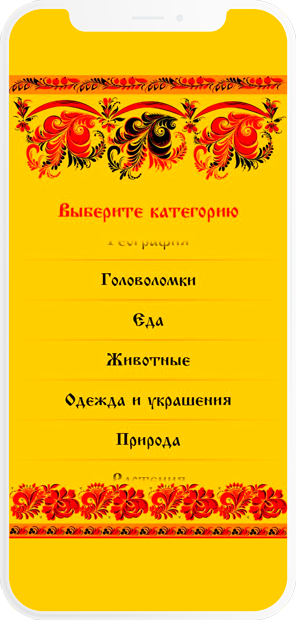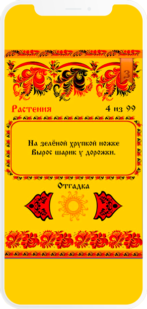 Собрано несколько тысяч русских загадок, разделил их на несколько категорий. Разработан пользовательский интерфейс приложения в русском стиле "Палех".
